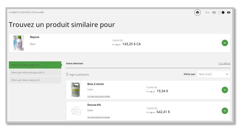 1. Lors d’une recherche de produit, un bouton ou un lien menant à une page de produits similaires sera accessible.